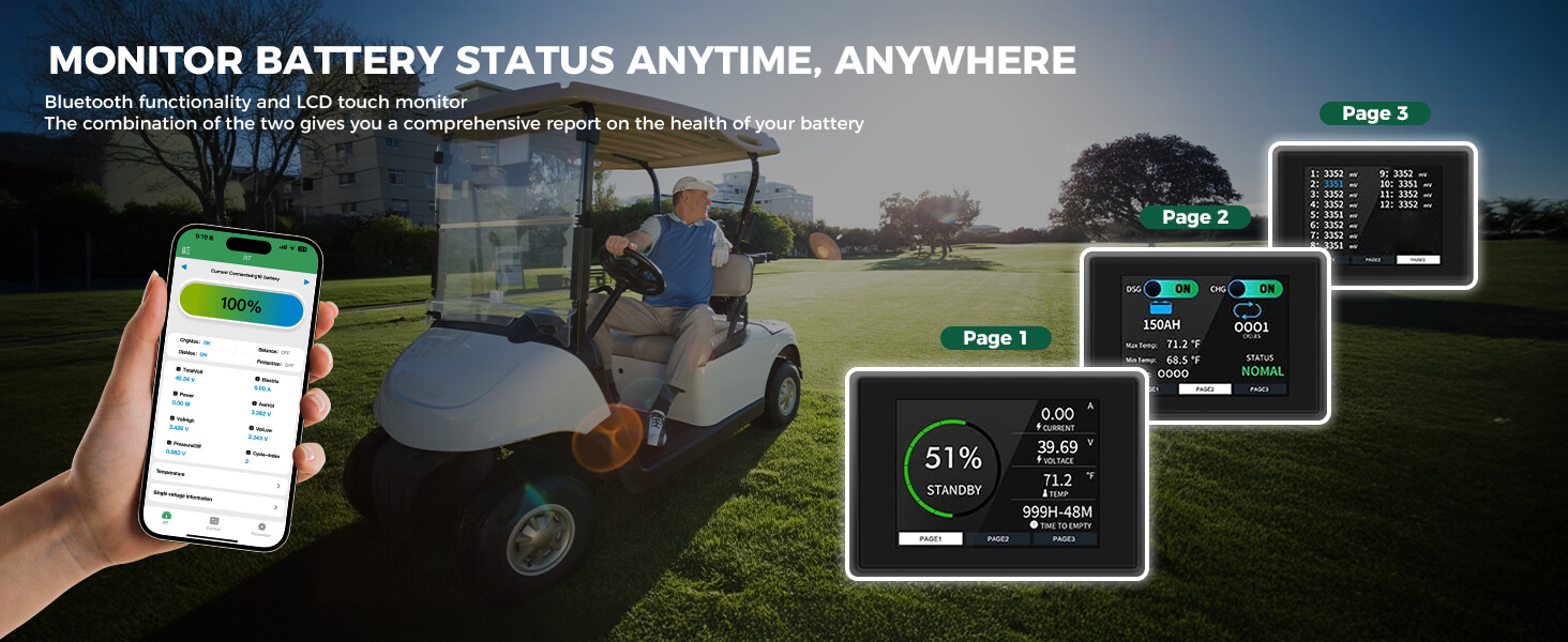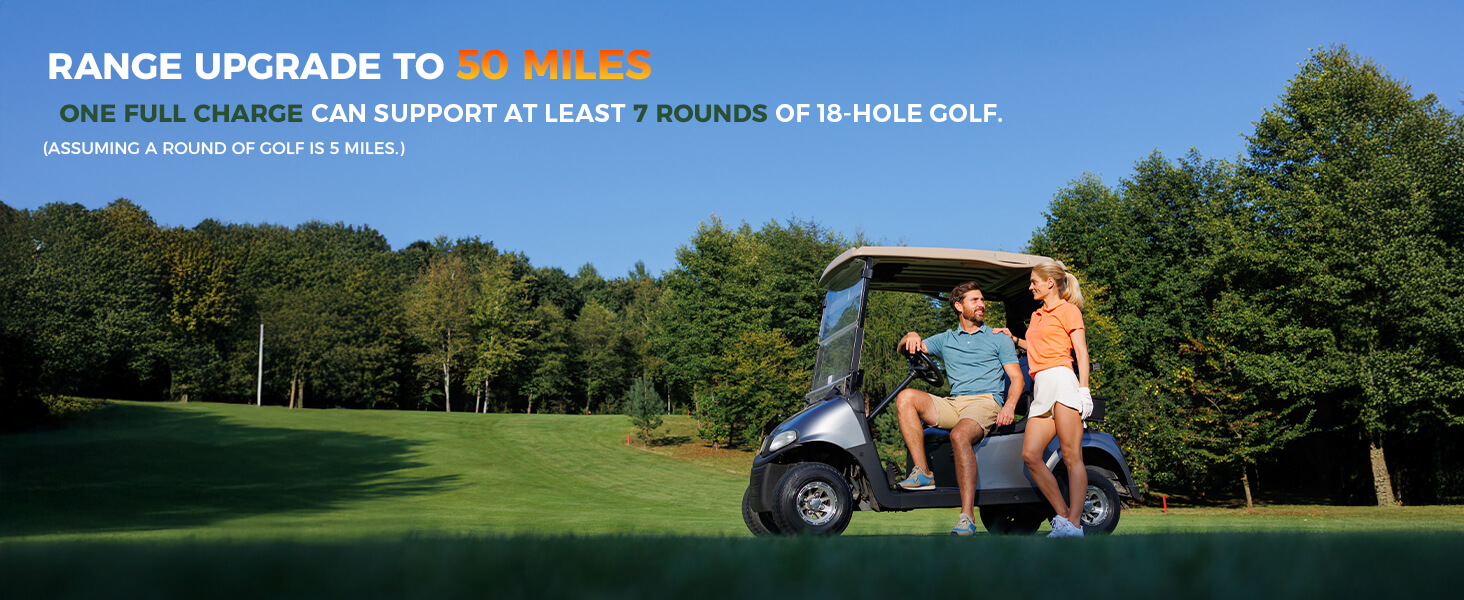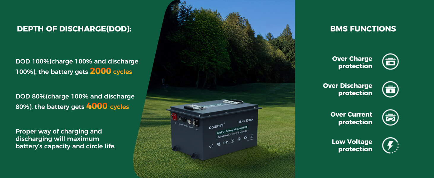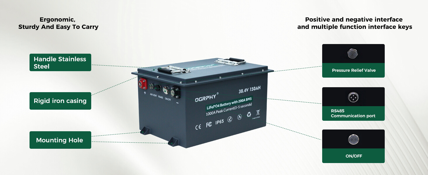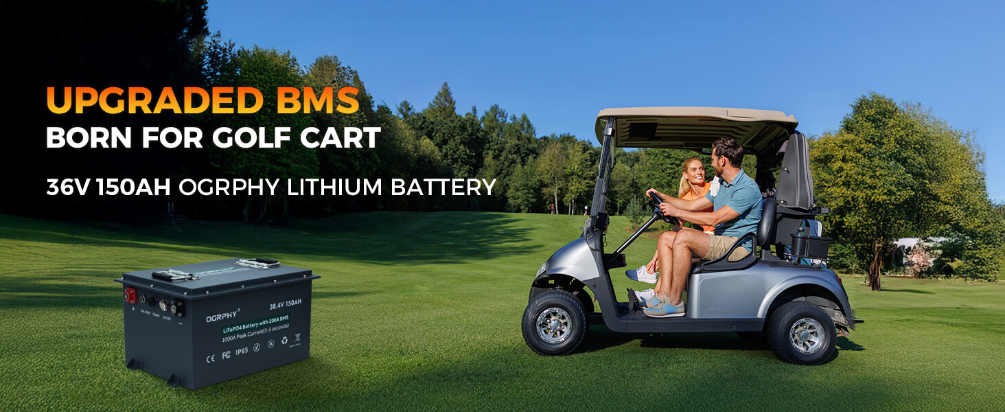 【1】OGRPHY 36V 150AH LiFePO4 battery holds 5.76kWh power, supports a 3kw golf cart drives 50 miles or more.