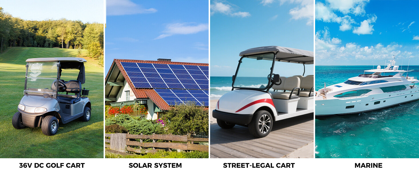 【4】Designed specifically for 36V golf carts, made of high-density A-grade cells for high energy(2C Discharge) and performance, The battery case is made of ABS, which is fireproof shockproof and IP65 waterproof, Compatible with all major brands of golf cart controllers, it is born for golf carts, electric vehicles, marine engines and other applications.
